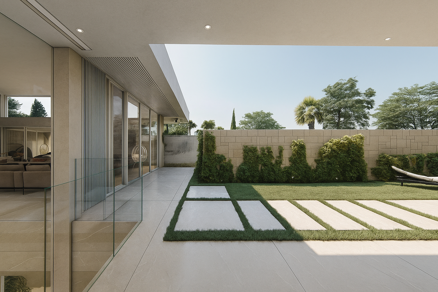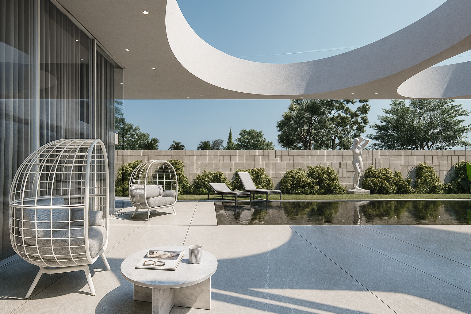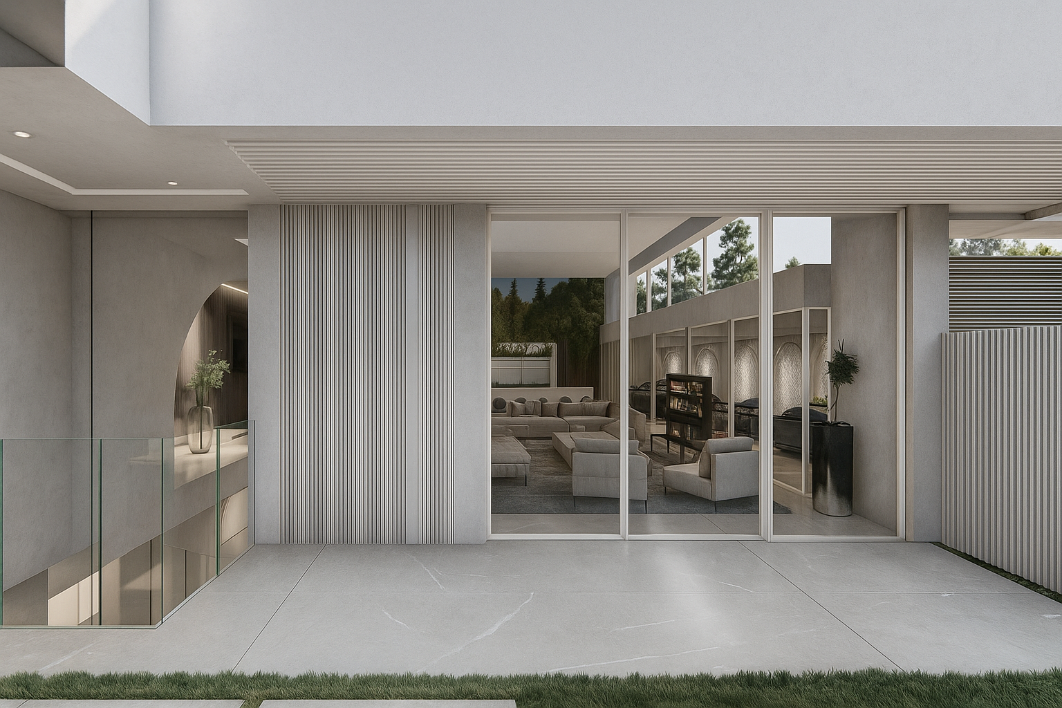 The architecture is clean modern and elegant. High ceilings and large glass openings create a bright atmosphere throughout the day.