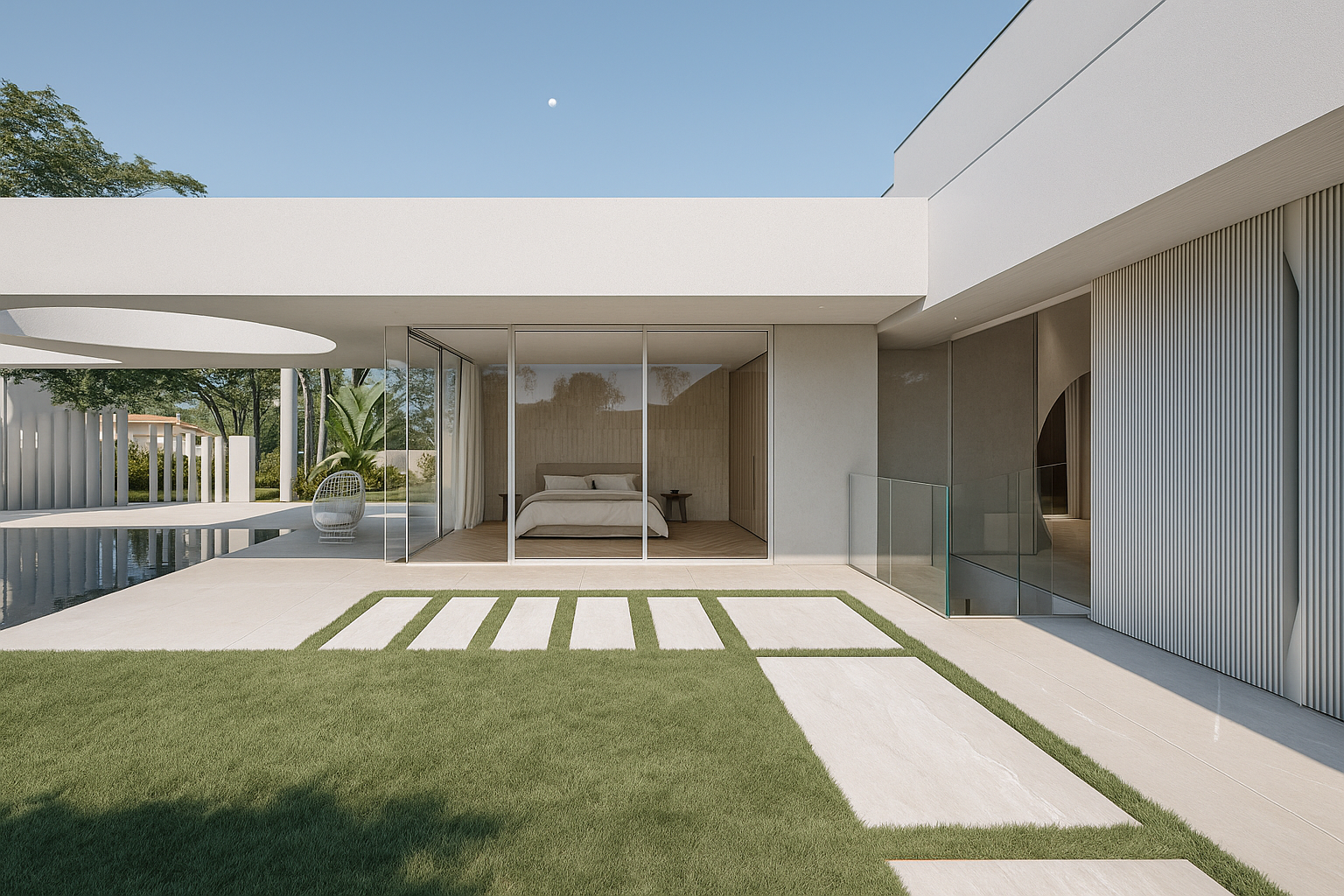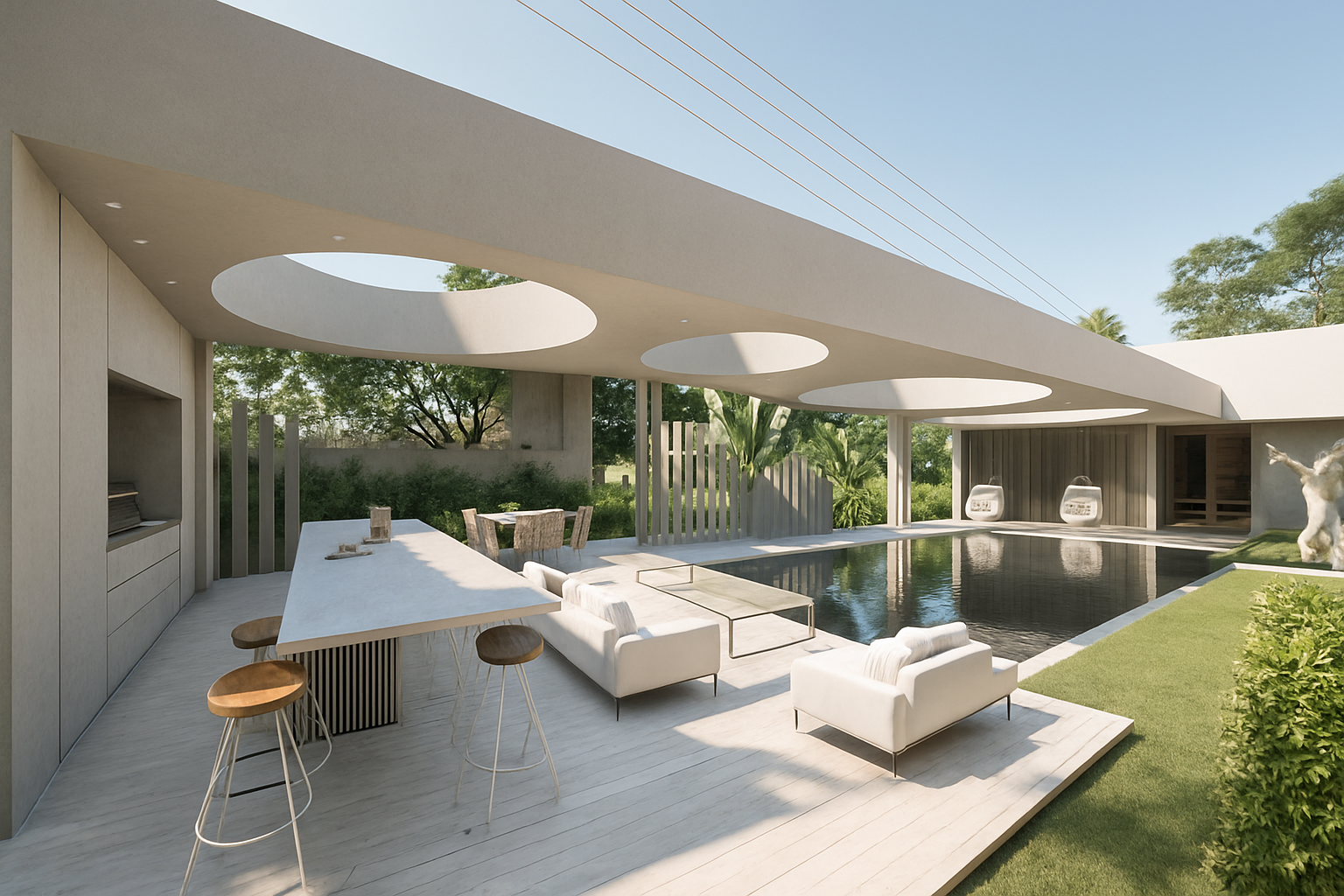 Every main space faces the pool and the garden which adds a strong feeling of openness.