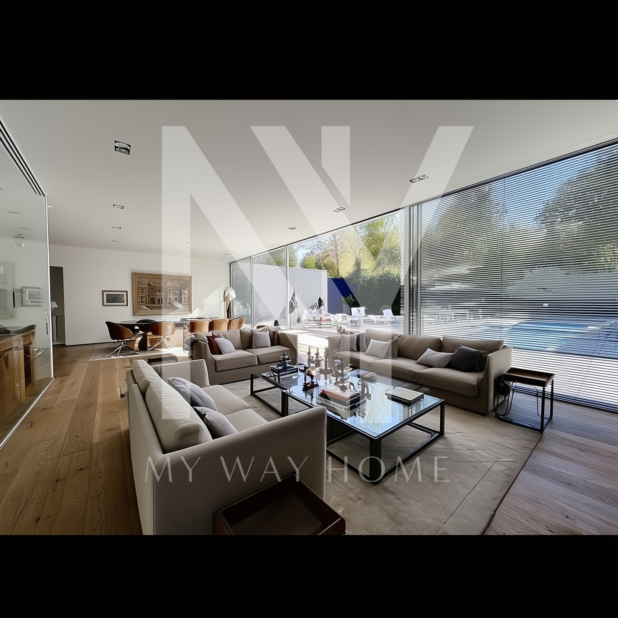 קומת הקרקע נפתחת לחלל אירוח נדיר בגודלו, עם ויטרינות זכוכית מהרצפה עד התקרה
